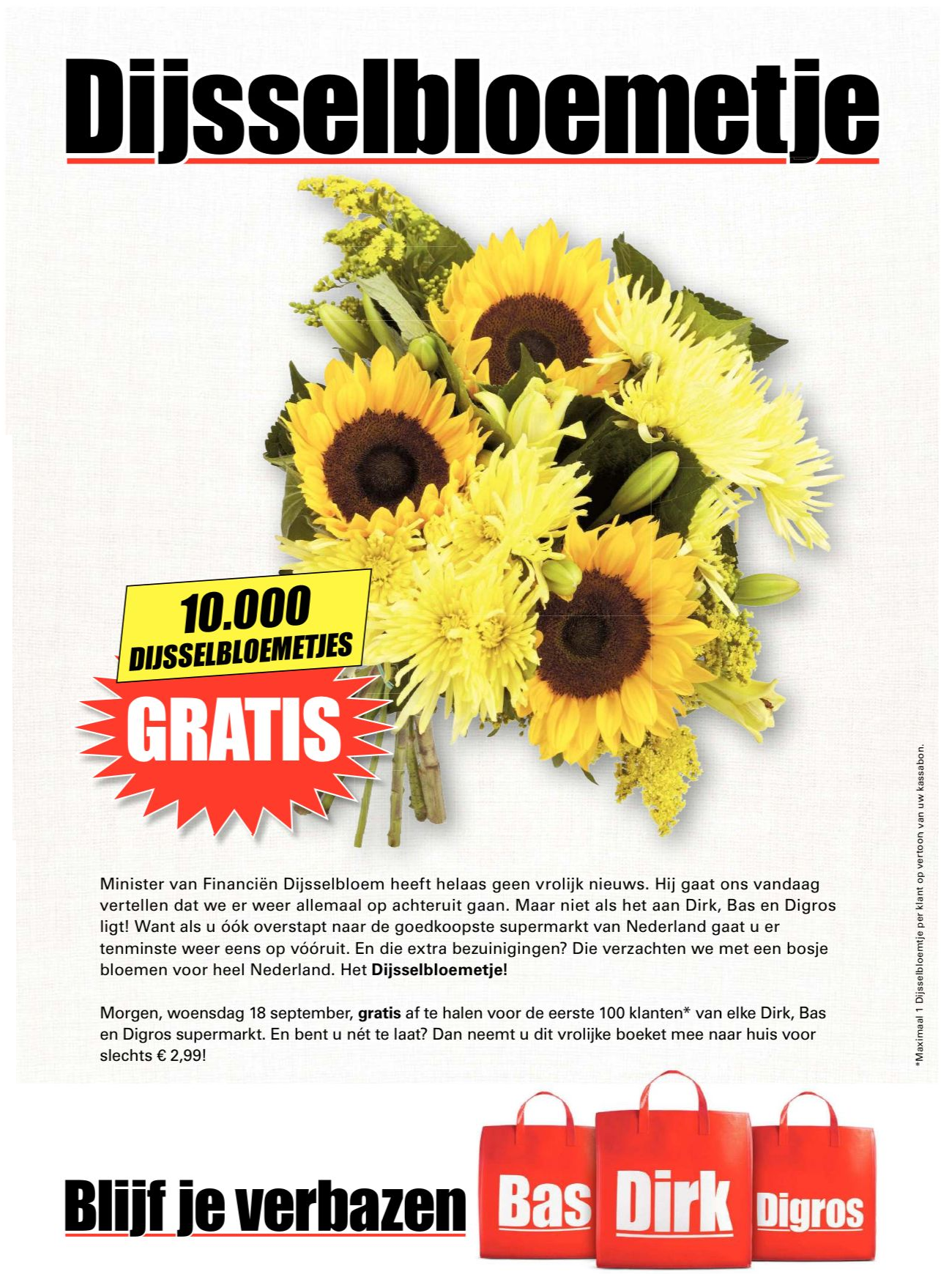 Dirk heeft een lange traditie als het gaat om inhaken op Prinsjesdag. In ieder geval al gedurende de vijf jaar dat de koopkracht daalt. De inhaker past goed in de huidige campagne en is daarom geen eenmalige uiting. Bovendien doet Dirk meer dan alleen een advertentie plaatsen in de dagbladen: het geeft morgen gratis ‘Dijsselbloemtjes’ weg, om de pijn van de bezuinigingen te verzachten.